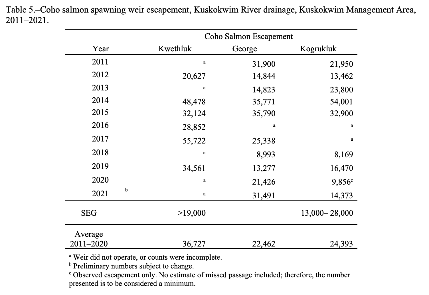 Coho salmon escapement was evaluated at two middle Kuskokwim River weirs in 2021. The George River weir coho salmon escapement of 31,491 fish was above the most recent 10-year average (2011–2020) of 22,462 fish (Table 5). At the Kogrukluk River weir, 14,373 coho salmon were counted, which met the sustainable escapement goal range (13,000– 28,000 fish).